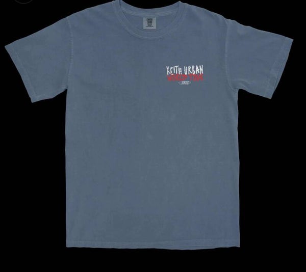 - Features "KEITH URBAN WORLD TOUR 2025" on the front left chest, and the HIGH AND ALIVE WORLD TOUR 2025 cities on the back.